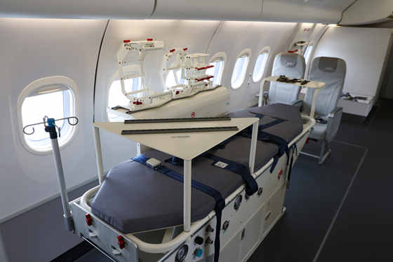 C909醫(yī)療機(jī)最大設(shè)計(jì)商載10噸,標(biāo)準(zhǔn)航程可達(dá)3700公里,具備高高原機(jī)場起降能力。艙內(nèi)布局可根據(jù)不同救援需求靈活改裝,能夠滿足醫(yī)療救援隊(duì)伍出行、邊遠(yuǎn)地區(qū)醫(yī)療救助、傷病員轉(zhuǎn)運(yùn)等多場景應(yīng)用。